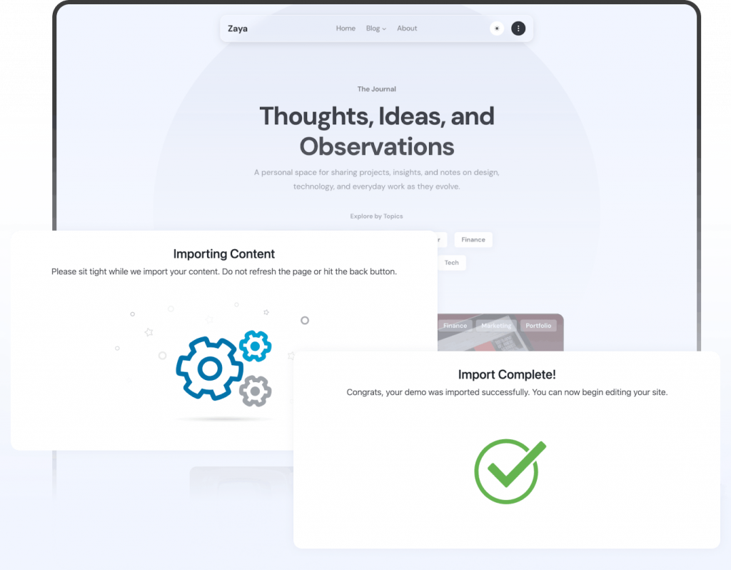 Import full demo content, layouts, and settings with a single click. No manual setup, no guesswork.
